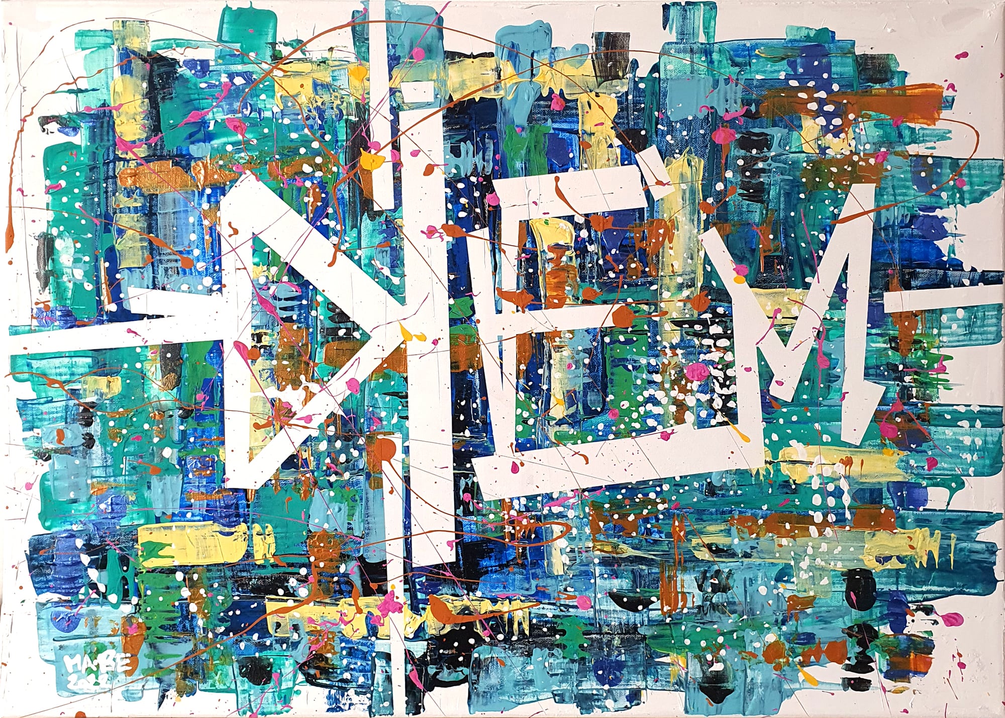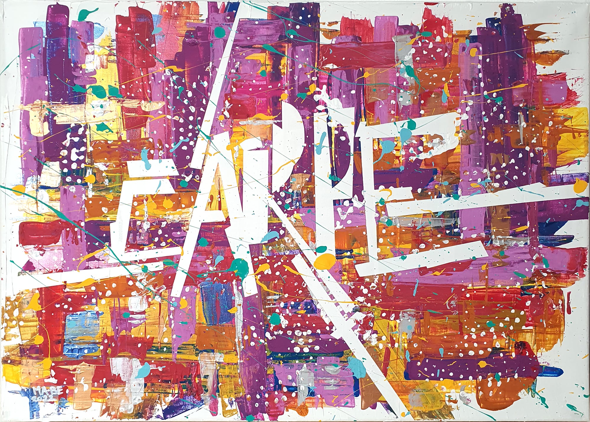 PROJECT “CARPE DIEM”, 2022 Acryl on canvas2x 70x50cm Carpe Diem. More than just 2 words. This work want to bring across the following: Break through of the grey grid of life.Bring color into life. Be spontanous.Be brave.Be open.Be optimistic. Seize the day. BACK
